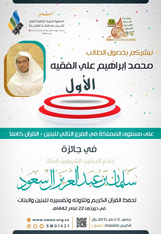 حصل الطالب محمد إبراهيم علي الفقيه على المركز الأول على مستوى المملكة في الفرع الثاني "حفظ القرآن الكريم كاملاً" في جائزة خادم الحرمين الشريفين الملك سلمان بن عبدالعزيز آل سعود-حفظه الله - لحفظ القرآن وتلاوته وتفسيره في دورتها ٢٢ لعام ١٤٤٢هـ، "الفقيه"، أحد طلاب جمعية سمو الخيرية لتحفيظ القرآن الكريم بمحافظة القنفذة.