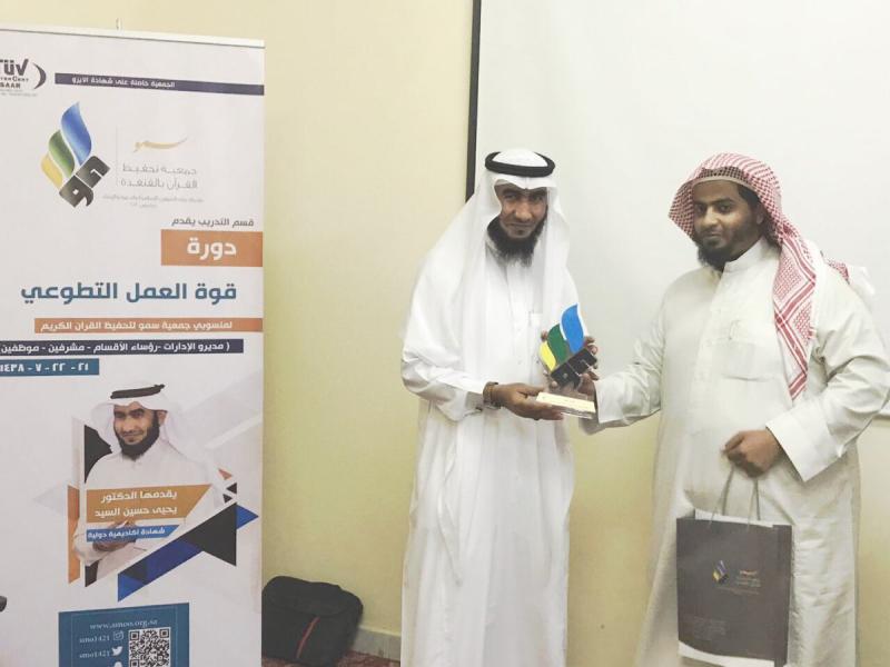 وفي اليوم الختامي الدورة كرمت الجمعية ممثلة بمدير إدارة الموارد المالية وإدارة العلاقات العامة والإعلام الأستاذ يحيى حسن الخيري المدرب الدكتور يحيى حسين السيد وقدمت له هدية تذكارية وشكر لتقديمها هذه الدورة.