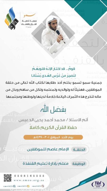 بفضل الله أتم الأستاذ محمد أحمد يحيى الدعيس حفظ القرآن الكريم كاملاً مساء يوم الأحد الموافق 1/3/1439هـ ، ويعد هذا الحافظ من أحد طلاب حلقات الموظفين وهي حلقة الإمام عاصم للموظفين ، حيث خُصصت ثمان حلقات لهم لتعليمهم كتاب الله.