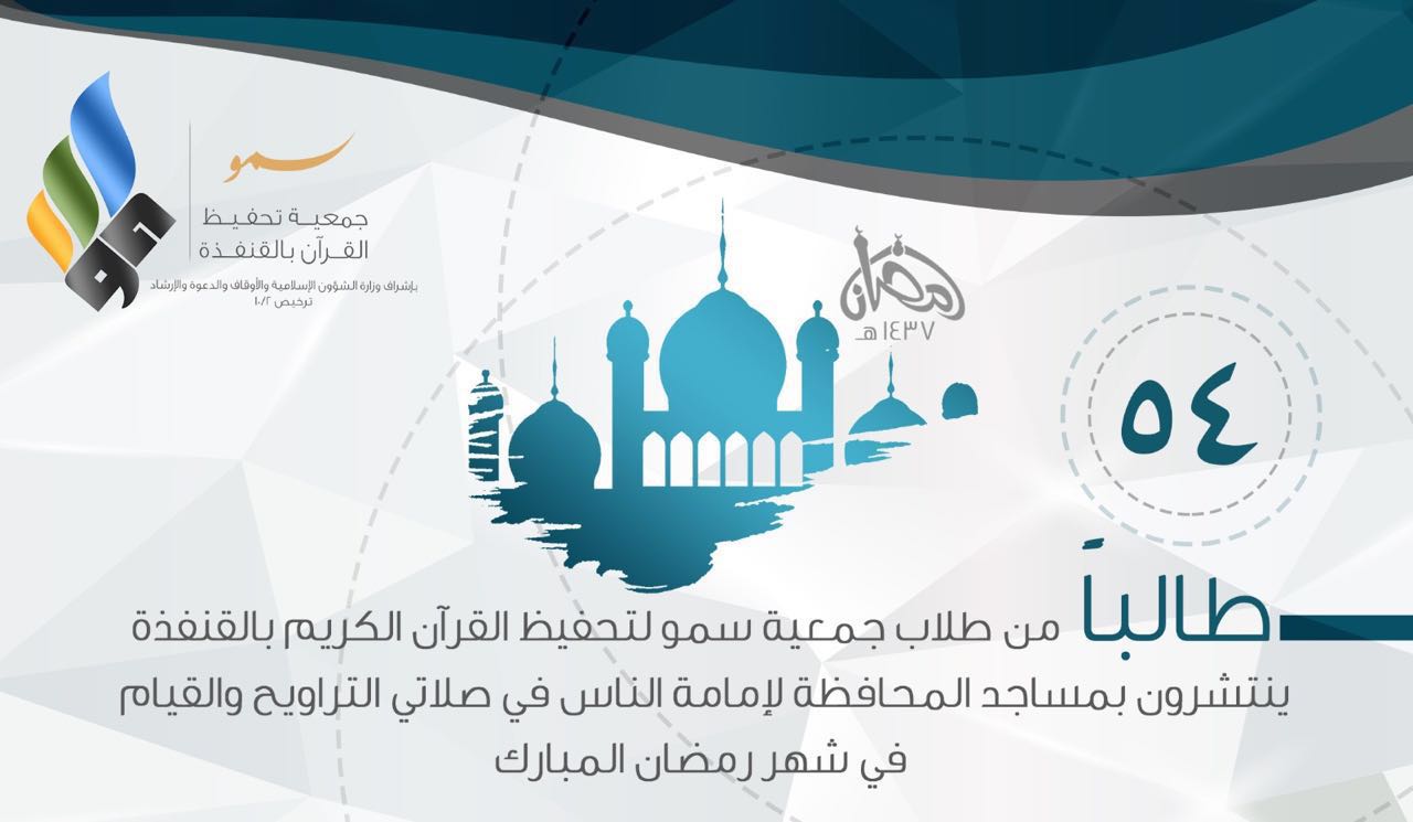 ضخت جمعية سمو لتحفيظ القرآن الكريم بالقنفذة ٥٤ حافظاً لكتاب الله لإمامة المصلين في صلاة التراويح في جميع جوامع ومساجد محافظة القنفذة ضمن نطاق تغطية الجمعية ، وأوضح رئيس الجمعية الشيخ احمد الجعفري قائلا: ان الجمعية تسعى دائماً لتقديم ما يفيد المجتمع وما يحقق رسالتها الرائدة من خلال البرامج الهادفة .