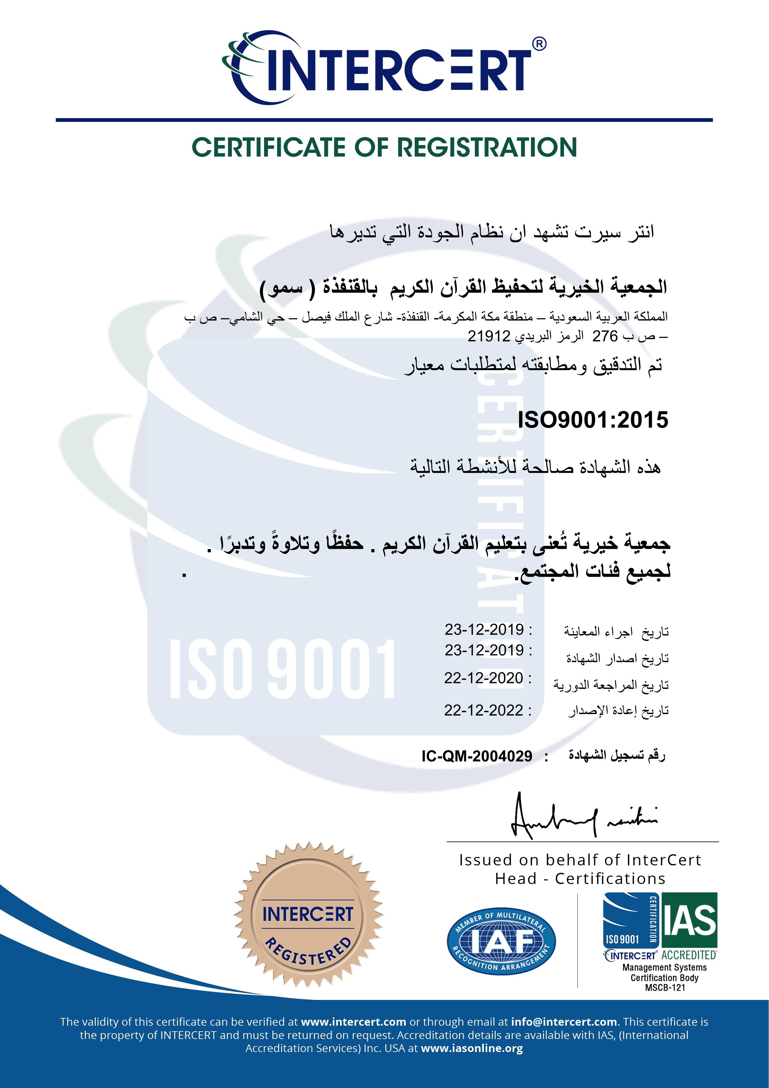 حصلت جمعية سمو على شهادة الايزو ISO 9001:2015 في نظام إدارة الجودة من شركة انتر سيرت المانحة لشهادات الآيزو ، ويأتي حصول الجمعية على شهادة الايزو لتنظيم وتميز العمل الإداري والتعليمي ، حيث اننا في الجمعية نواكب الاحداث للوصول الى هدفنا ونشر رسالتنا التعليمية والتربوية في خدمة كتاب الله .