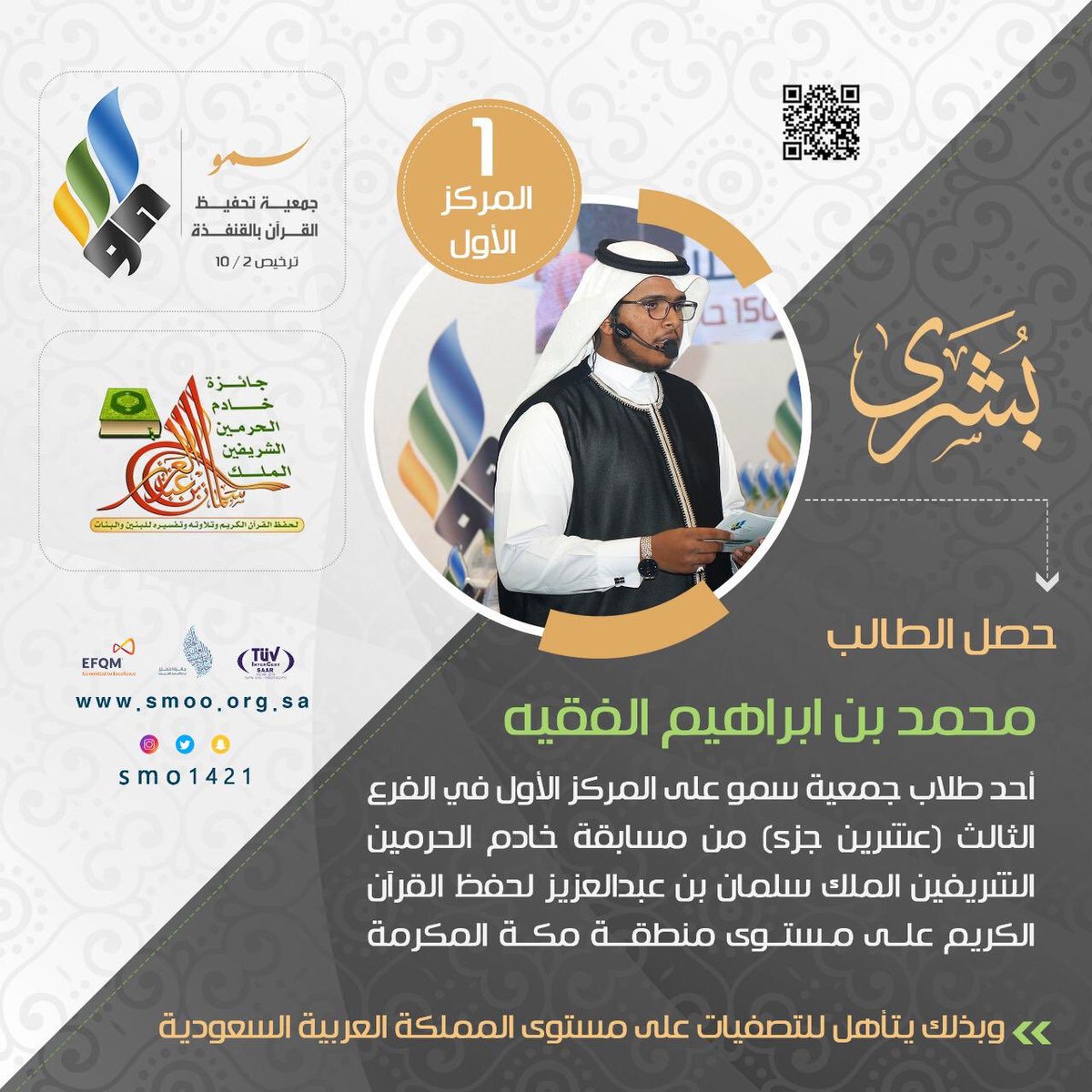 حقق الطالب محمد بن إبراهيم علي الفقيه ، من طلاب جمعية سمو المركز الأول على مستوى منطقة مكة المكرمة في الفرع الثاني (حفظ القرآن كاملاً) في مسابقة خادم الحرمين الشريفين الملك سلمان بن عبدالعزيز آل سعود، لحفظ القرآن الكريم وتلاوته وتفسيره للبنين والبنات للعام 1441.