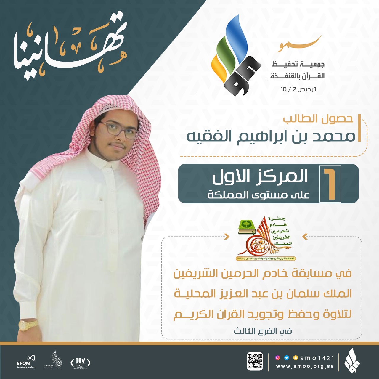 حصل الطالب محمد إبراهيم علي الفقيه على المركز الأول على مستوى المملكة في الفرع الثاني "حفظ القرآن الكريم كاملاً" في جائزة خادم الحرمين الشريفين الملك سلمان بن عبدالعزيز آل سعود-حفظه الله - لحفظ القرآن وتلاوته وتفسيره في دورتها ٢٢ لعام ١٤٤٢هـ، "الفقيه"، أحد طلاب جمعية سمو الخيرية لتحفيظ القرآن الكريم بمحافظة القنفذة.