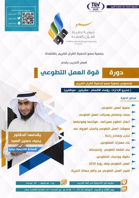 أقامت الجمعية دورة تدريبية يوم الثلاثاء الموافق 21-07-1438هـ ولمدة يومين لمنسوبيها من مدراء الإدارات ورؤساء أقسام ومشرفين وموظفين بعنوان (قوة العمل التطوعي) نفذها المدرب الدكتور يحيى حسين السيد.