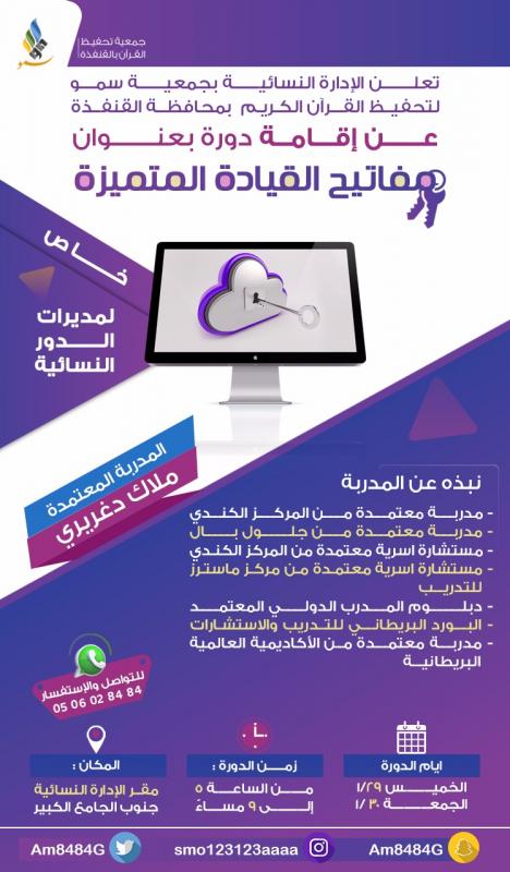 استمراراً للعمل المؤسسي بالجمعية في تنوع المناشط والدورات تنفذ الإدارة النسائية بالجمعية قريباً دورة (مفاتيح القيادة المتميزة) ويأتي ذلك ضمن الخطه السنوية في مجال التدريب والتاهيل لهذا العام ، وتقدم الدورة من قبل مدربه معتمدة في هذا المجال ، وينصب ذلك في صالح المستهدفين من عمل الجمعية التي تسعى إليه نحو استراتيجيتها لهذا العام في تعليم كتاب الله .