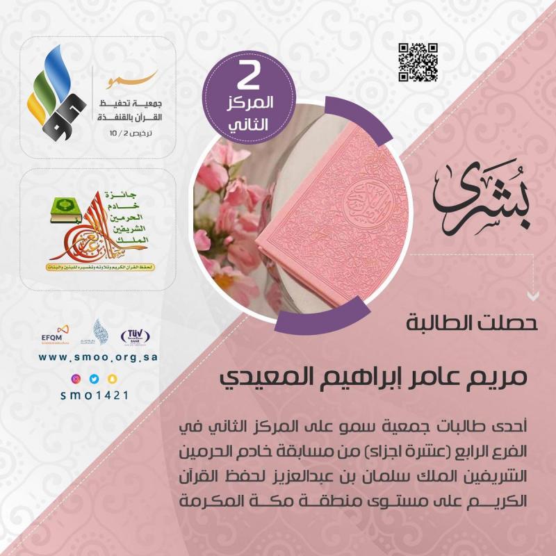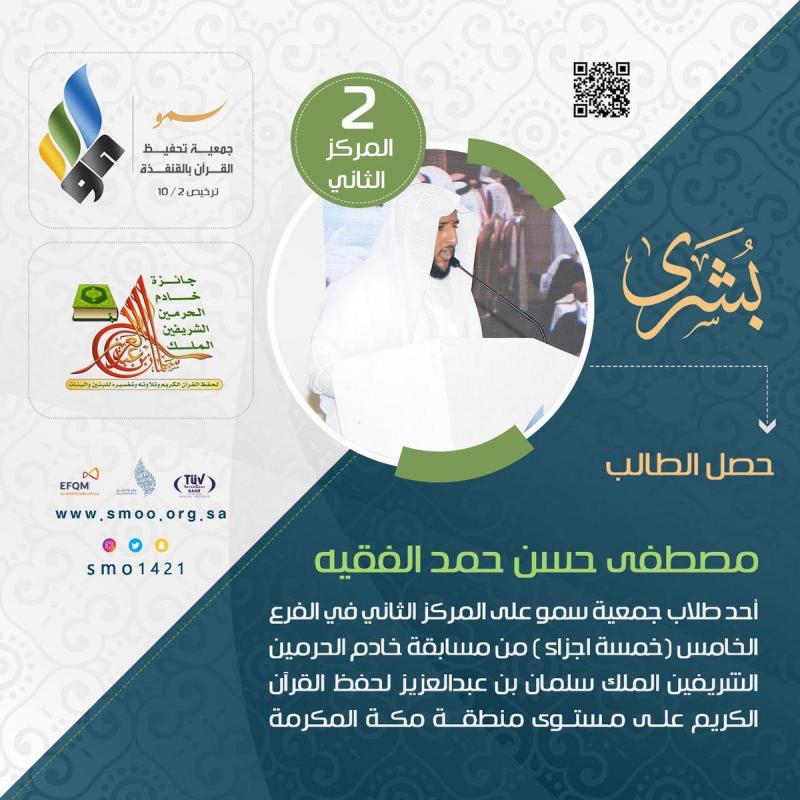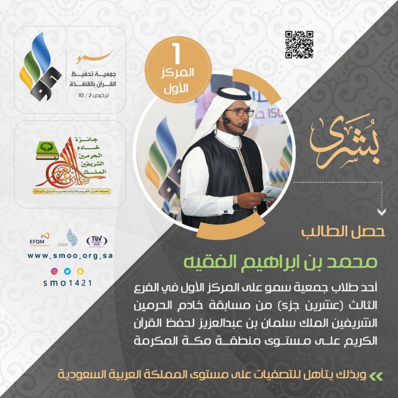 فضل الله تعالى ثم ثمار الدعم ونتاج الجهود الكبيرة تأهل الطالب محمد بن إبراهيم الفقيه من جمعية سمو للتصفيات النهائية لمسابقة الملك سلمان لحفظ القرآن الكريم على مستوى المملكة العربية السعودية بعد تحقيقه المركز الأول على مستوى مكة المكرمة في الفرع الثالث (20 جزء) ، وكذلك حصل الطالب مصطفى حسن حمد الفقيه من جمعية سمو على المركز الثاني على مستوى مكة المكرمة في الفرع الخامس (5 أجزاء) من مسابقة خادم الحرمين الشريفين الملك سلمان لحفظ القرآن الكريم ، وكذلك حصلت الطالبة مريم عامر إبراهيم المعيدي من جمعية سمو على المركز الثاني على مستوى مكة المكرمة في الفرع الرابع (10 أجزاء) من مسابقة خادم الحرمين الشريفين الملك سلمان لحفظ القرآن الكريم (بنات).